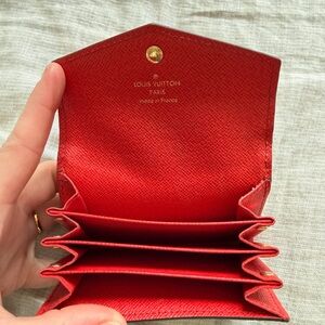 Chic and compact Louis Vuitton wallet with vibrant red and classic brown monogram. Adds luxury to daily use.