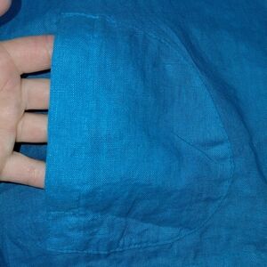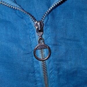 Casual linen turqoluoise blue zip-up hoodie with drawstring hem and hood. There are pockets! Three-quarter sleeves. Great layering piece for Spring!
