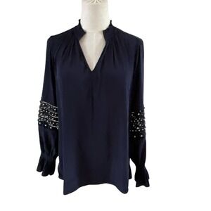 Chico's Embellished Sleeve Blouse Top Navy Blue Ruffle Neckline Sz .5 XS 6 Boho