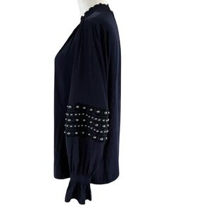 Keywords: Chicos, Blouse, Top, Navy Blue, Embellished, Beaded, Ruffle, Long Sleeve, Womens, Crochet, dressy top, career blouse, party top