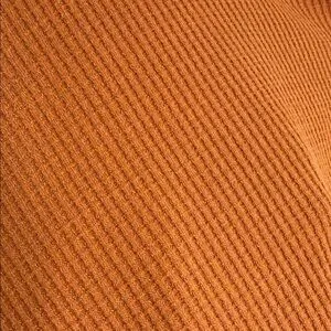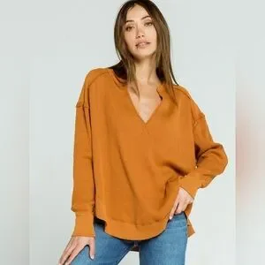 Cozy and effortlessly cool We The Free waffle knit sweater in a rich rust brown color. Features an oversized fit, raw-edge V-neckline, drop shoulders, and a slightly longer back hem for that laid-back Free People look.