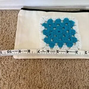 This stylish pouch features a handmade crochet accent in blue on a cream background. Perfect for organizing your essentials with a touch of elegance.