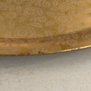 Elegant vintage blue glass creamer and sugar set with gold accents. Each has a pontil type mark embossed on the bottom. Not sure of age, but would be 1970’s or earlier. I’ve included an aluminum gold tray, which is from the 1960’s. The creamer & sugar bowl measure approximately 3.25” wide x 2” high. The tray is 7”x 12.5”. Please review any imperfections in the pictures and contact me with any questions.