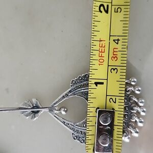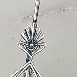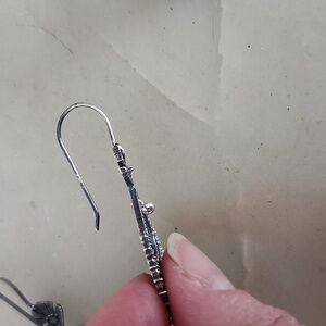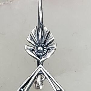 These elegant silver dangle earrings feature intricate detailing, perfect for adding a touch of sophistication to any outfit.