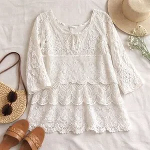 Three-quarter lace sleeves, tiered crochet panels, and scalloped edges give this piece that elevated boho / cottagecore / romantic coastal aesthetic that’s trending right now. It layers beautifully over a tank, bralette, or slip dress and works effortlessly for spring, summer travel, beach dinners, festivals, or relaxed resort styling.