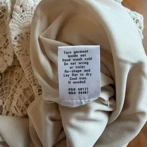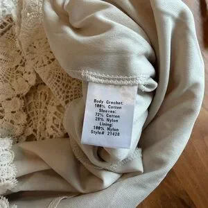Beautiful TravelSmith lace crochet tunic in size XL, made in the USA. This romantic ivory/cream top features intricate layered crochet detailing throughout with a scalloped hem and a soft built-in lining for coverage. The neckline includes a delicate satin ribbon tie for an adjustable, feminine finish.