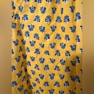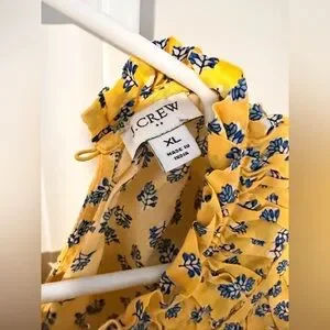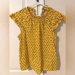 Chic floral blouse with ruffled sleeves. Vibrant yellow with blue accents. Ideal for casual wear.