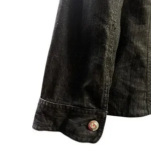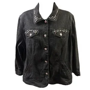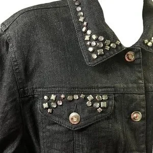 Ruby Rd Denim Jacket Black Embellished 3/4 Sleeve Glam Sparkle Rhinestone 14