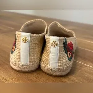 These are Tory Burch Raffia Flat Espadrilles in the "Natural Fruit Basket" design.