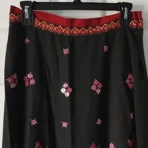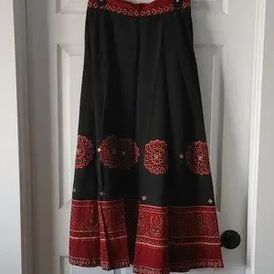 Willi Smith Maxi Skirt Sz 6 Black & Red Indian Sari-Style W/ Embroidered Mirrors