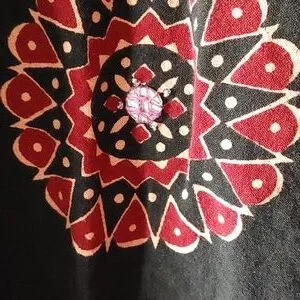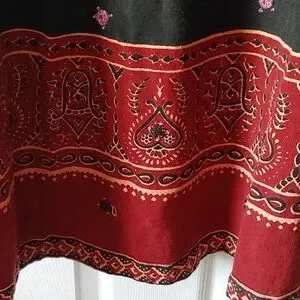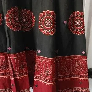 Stylish maxi skirt with intricate patterns. Features bold black and red colors, and embroidered mirror. Perfect for versatile wear.