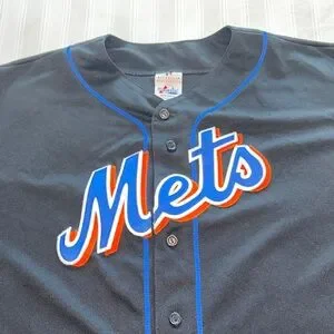 Men's Majestic jersey. Black with blue piping. Features Mets logo in orange and blue.