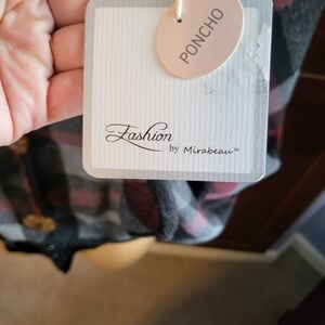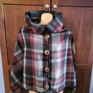 Chic plaid women's poncho featuring a button and snap closure. Ideal for adding a touch of elegance to your wardrobe. Buttons and Snap for detail only. Does not come apart.