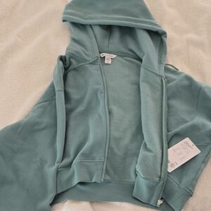 Cozy teal hoodie from Athleta. Features a full zip and drawstring hood. Perfect for casual wear.