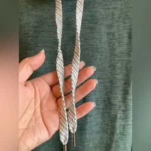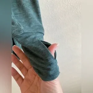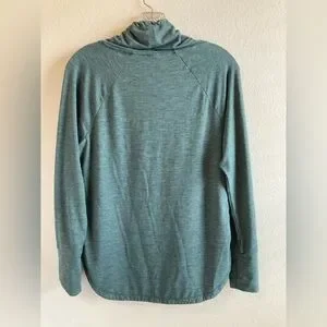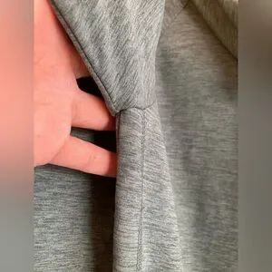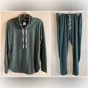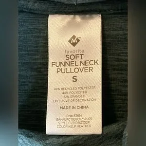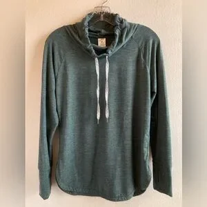Soft funnel neck pullover with drawstrings. Thinner than a sweatshirt, more like soft pajama or loungewear fabric. Has a bit of pilling, mostly on the wearer’s left shoulder (see photos.) Most of the pilling blends in with the fabric color. Still in good condition and very soft and comfortable.