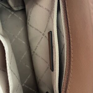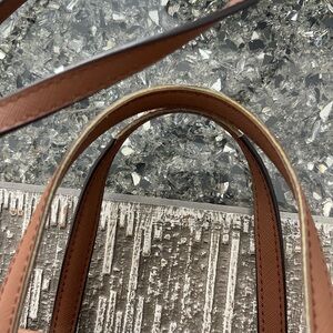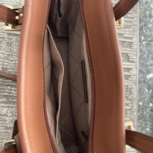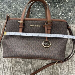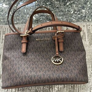Elegant satchel with signature MK pattern. Rich brown leather and gold-tone accents. Perfect for everyday use.