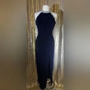 High quality velvet dress. So elegant! No flaws. Size 6. The spots on the cover photo are just reflection. I can’t decide on the color. I want to say it’s a dark purple/ blue. Leaning more to the blue side. The dress is more of a size 4 in today’s size
