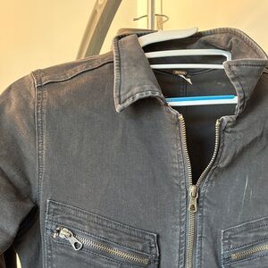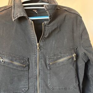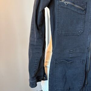 Stylish black jumpsuit. Features front zipper and pockets. Perfect for casual wear. Twill is very stretchy.