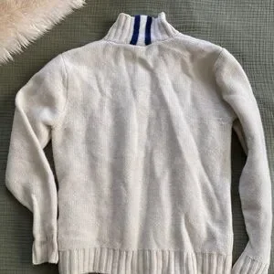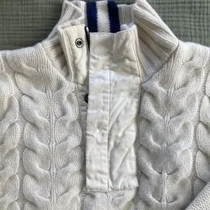 Stylish cream cable knit sweater with stripe detail on collar. 100% lambs wool