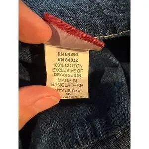 The Tudor Court ladies XL denim jacket features a basic style with floral embroidery, offering a versatile and casual look. Made from cotton with a solid blue color, it has a mid-length cut and long sleeves, suitable for spring. The jacket is designed for women and includes a button closure. Ideal for casual occasions, it can be paired with various outfits for a relaxed yet stylish appearance. Manufactured in Bangladesh, it is machine washable and fits regularly. This pre-owned jacket is in good condition.