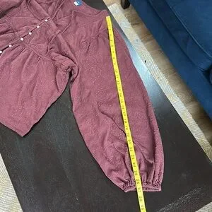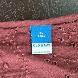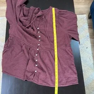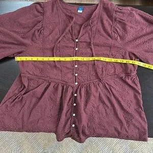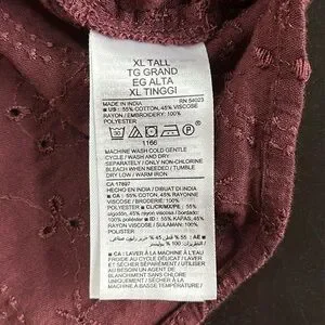 Excellent preowned condition. Cotton blend. Eyelet with 1/2 button down. Long puff sleeves with elastic cuffs. Beautiful burgundy wine shade. SZ XL tall. Please confirm measurements approximate laying flat in pictures as Poshmark does not accept returns for fit issues. Please scroll to see all ten photos provided.