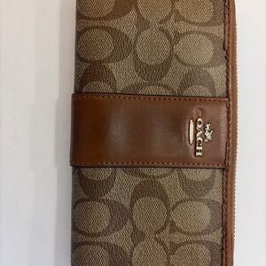 Authentic Coach signature accordion zip wallet in khaki/brown coated canvas with leather trim.