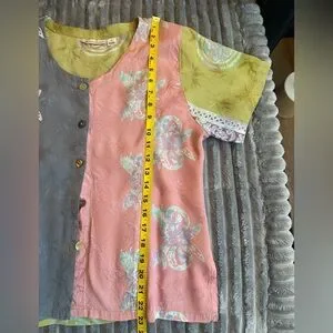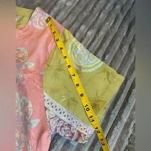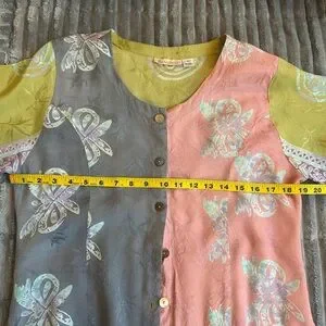 Excellent preowned condition. Silky feel with a billowy drape. Darting in Front. SZ M. Please confirm means approximately laying flat in pictures as Poshmark does not accept returns for fit issues. Please scroll to see all eight photos provided.