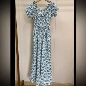 Elegant blue floral maxi dress with short sleeves. Perfect for any occasion.