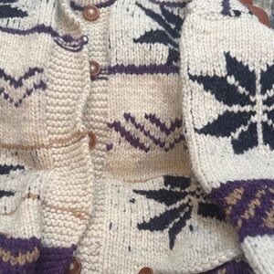 Warm 100% Wool knit cardigan featuring a snowflake design. Cream base with black and purple accents. Wooden buttons add a rustic touch. I’d wear this with a turtle and NO jacket and was warmer than anyone in the snow! Smoke-free home