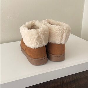Stay warm and stylish with these tan ankle boots featuring a plush cream fur lining. Perfect for adding a touch of comfort to your winter wardrobe.