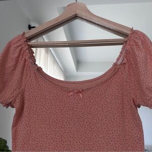 Elegant peach blouse with floral pattern. Features short sleeves and a delicate bow detail. Ideal for casual wear.