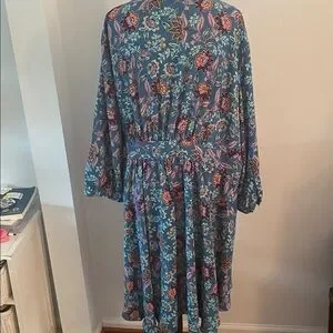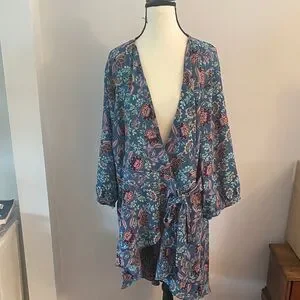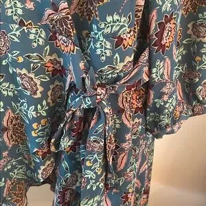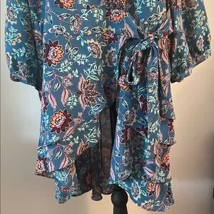 Torrid size 3 wrap tie open front high low top no tags,but never worn beautiful colors! 3/4 sleeves. 30 -38 inches shorter in front longer in back. 26 inches pit to pit lying flat 22 inches waistline lying flat.