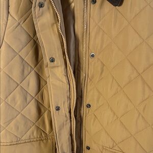 Stylish quilted puffer jacket. Features a dark collar and front pockets. Perfect for cold weather. Zipper and snap on buttons. Lightweight