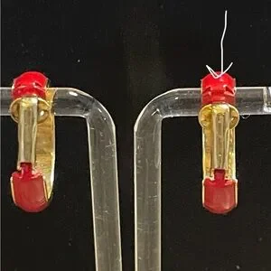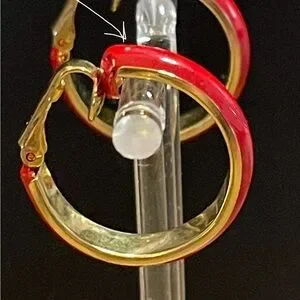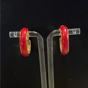 Add a pop of color to your outfit with these pretty red hoop and gold tone clip-on earrings. There is a pinpoint size white spot at the top of one of the earrings. See pics.