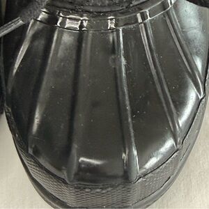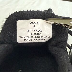 Great quality waterproof shoes from Sperry. Sort of a Top-sider upper styling, but with a lug-type sole. Has quilted accent and fleece lined for added comfort and warmth. Women’s US size 6; in black. See photos for style details and condition. I only noted one mark on toe area of left shoe (pics). These are quality rain shoes in really good condition.