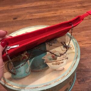 Red Satin-like classy purse. Can be used for formal occasions or even when dressed down to add some flare. Used once or twice. Like new. Has a detachable chain for shoulder carry. Zippered pocket inside and entire top zips up for security. Very roomy!