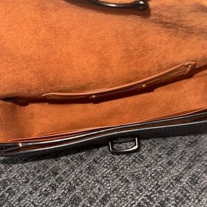 BNWT Gorgeous Authentic Coach extremely elegant and great for any occasion. A beautiful black leather with a beautiful brown suede interior Sleek black leather removable strap to be used as a clutch. I bought it at the Coach boutique and never used it. Features signature C clasp that comes with a key to lock bag. This bag is stunning.