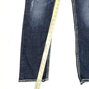 Silver Jeans Co. mid-rise denim features a dark wash with heavy contrast thick-stitch detailing and subtle distressed whiskering. These straight leg jeans are designed with a classic five-pocket construction, including signature embroidered back pockets and branded hardware. The durable denim blend provides a comfortable fit with a touch of stretch for everyday wear.