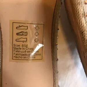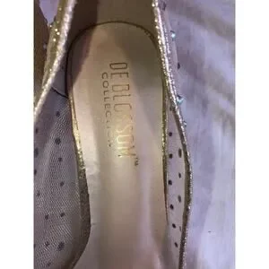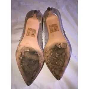Nude or champagne color mesh embellished with iridescent crystals, pointed toe with approx 2" kitten heel. Excellent gently worn condition.
