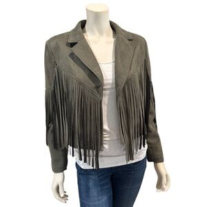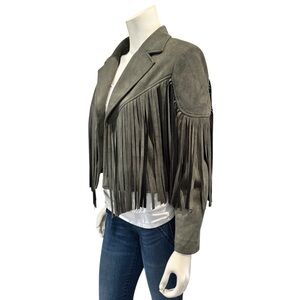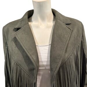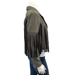 Gorgeous khaki green faux suede jacket features a row long fringe across front/sleeves/back. Open front with notched collar. Mild cropped length. Fully lined. Serious western boho style!
