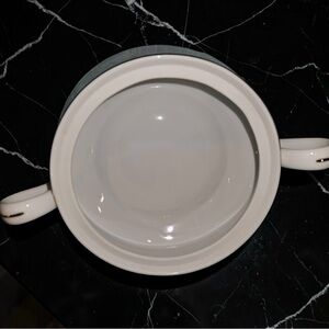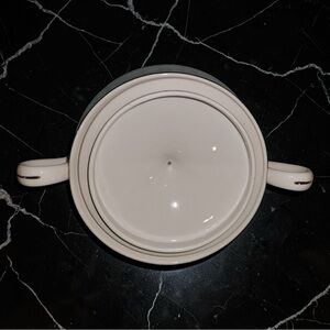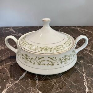 The Allegro pattern was produced by Fine China of Japan during the mid-to-late 20th century, featuring elegant green floral scrollwork with gold trim on white porcelain. This pattern was part of the post-war Japanese export china boom when Japanese manufacturers produced high-quality dinnerware for Western markets. Covered vegetable bowls like this were essential pieces in formal dining sets, valued for their functionality and decorative appeal. These pieces appeal to vintage dinnerware collectors, those seeking replacement pieces for inherited sets, and enthusiasts of mid-century Japanese export china.
