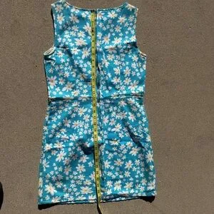 Embrace a fresh look with this sleeveless vintage floral dress. Featuring a vibrant blue background adorned with white flowers, it's perfect for any occasion. Stay stylish and comfortable all day long. No size but measurements in photos.