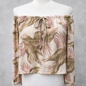 Billabong “Light It Up” tropical off-shoulder blouse in Size Medium, New With Tags. Featuring a soft cream base with olive and pink palm leaf print, this lightweight woven top has an adjustable drawstring neckline that can be worn on or off the shoulders for effortless boho-resort styling.