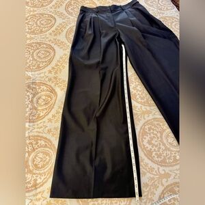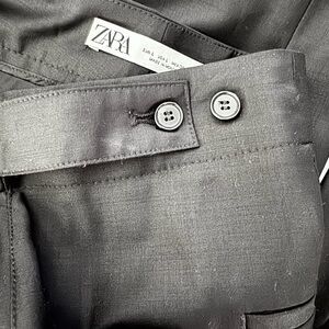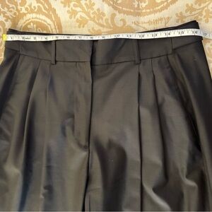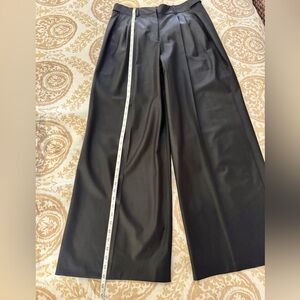 You will channel your inner Hollywood screen goddess in these uber glam wide leg black pleated trousers from ZARA. The lightweight fabric (fabric label was missing, but I am guessing it’s a poly-acetate blend) has a subtle sheen that catches the light and moves beautifully. Size Large, has a two-button adjustable waist for a gap-free fit. In mint condition from a smoke-free home.