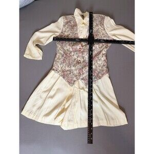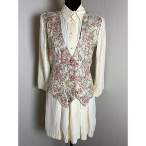 Vintage 1990s AOLIB Romper featuring an attached floral tapestry vest overlay and cream collared blouse style bodice. Pleated shorts with an adjustable back waist tie for shaping. Pearl- style decorative buttons and Victorian-inspired cottagecore aesthetic. Made in the USA. Dry clean only. Excellent vintage condition. See photos for measurements.
