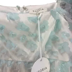 Whimsical and romantic Storia by Anthropologie mini dress featuring pastel rainbow floral embellishments over a sheer overlay for an ethereal fairy-core look. Designed with sheer puff sleeves, a flattering square neckline, and a lined babydoll silhouette. Back zipper closure.