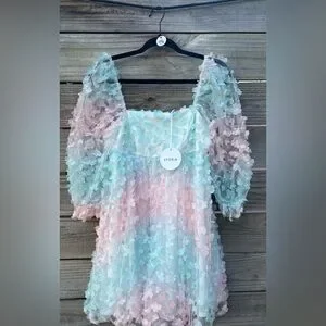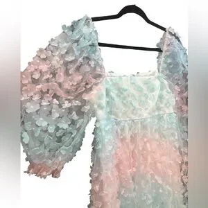 Keywords: pastel floral, fairycore, Anthropologie style, Easter dress, bridal shower, spring mini, romantic, cottagecore, sheer sleeves, garden party