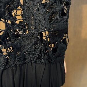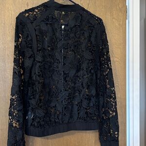 Chic black lace bomber jacket. Features floral lace design. Stylish and versatile.
