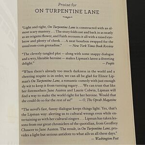 Elinor Lipman may well have invented the screwball romantic comedy for our era, and here she is at her sharpest and best. On Turpentine Lane is funny, poignant, and a little bit outrageous.”