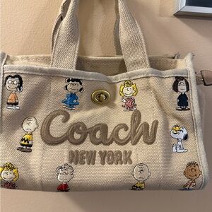 The Coach Peanuts Collab Canvas 2way Bag With Peanuts Branded NWTCardholder is a stylish small-sized handbag featuring a classic Peanuts pattern and character design. Made of leather with a zip closure, this natural tan exterior bag includes a cardholder, making it a versatile accessory for women. The Coach Peanuts product line adds a touch of sophistication to this everyday use item, perfect for showcasing both fashion and functionality. Also includes hangtag and coach crossbody strap.